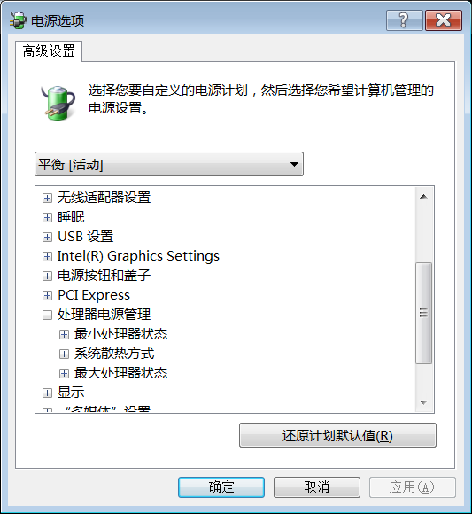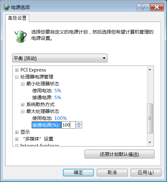 另外我是在高性能電源模式改的100%,玩游戲的時(shí)候才開(kāi)啟高性能,平時(shí)就用平衡模式,平衡模式設(shè)置如下: